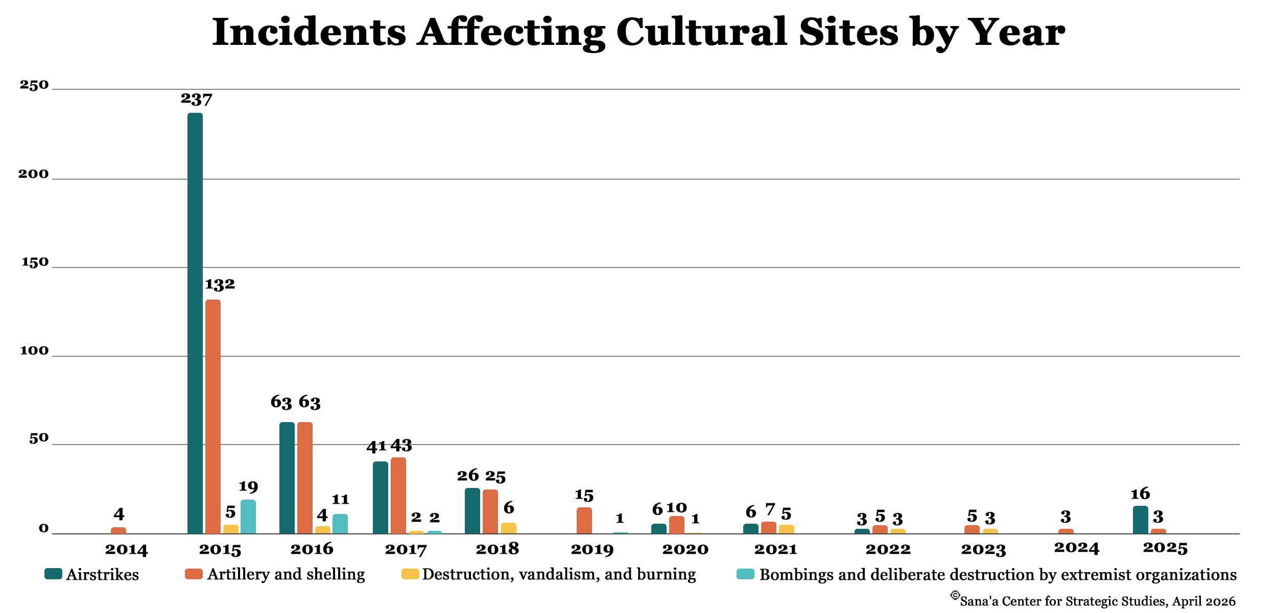 The year 2015 stands as the most devastating period for Yemen’s archaeological heritage. While airstrikes accounted for a significant portion of the damage, the date reflects a complex reality: a single military operation often comprised multiple strikes and bombings, though these are frequently recorded as a single event. Beyond aerial bombardment, cultural sites were further decimated by ground-based attacks, including the use of landmines and car bomb attacks by extremist organizations, foremost among them Al-Qaeda in the Arabian Peninsula (AQAP).