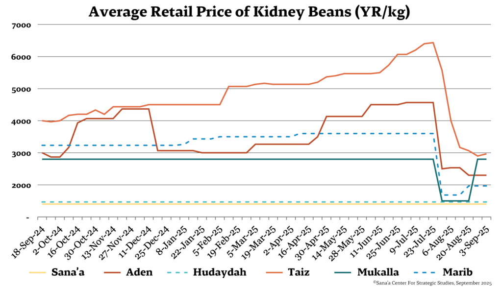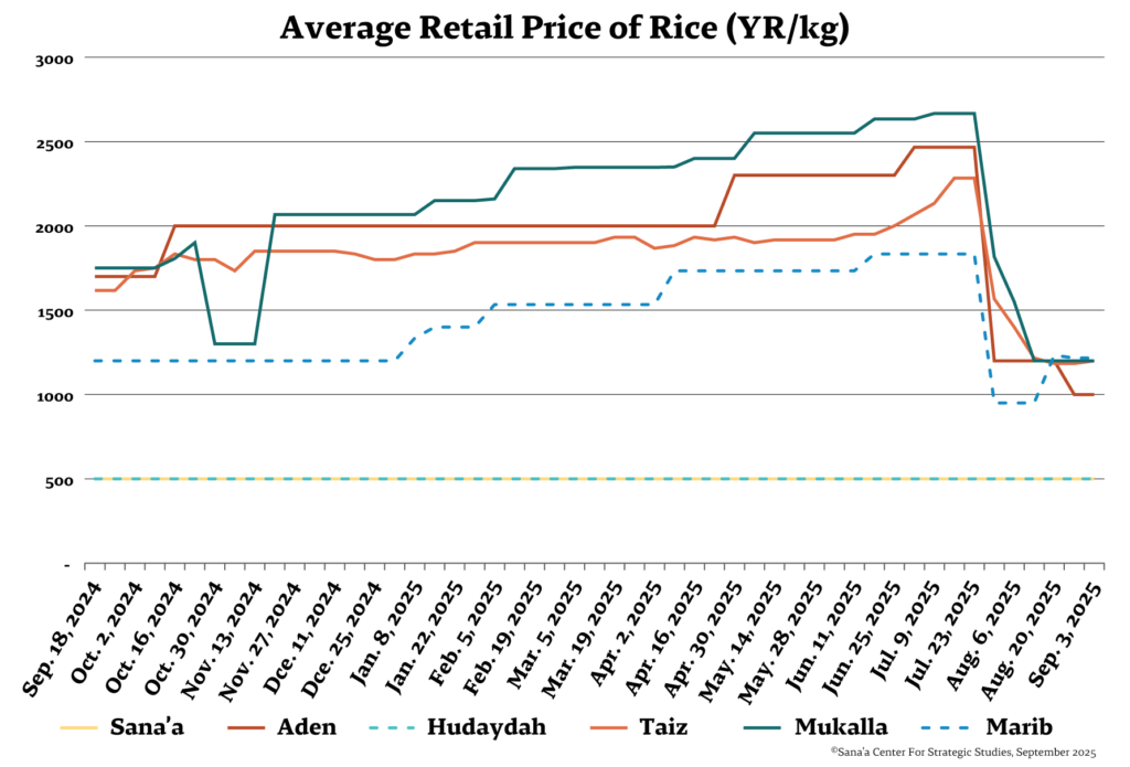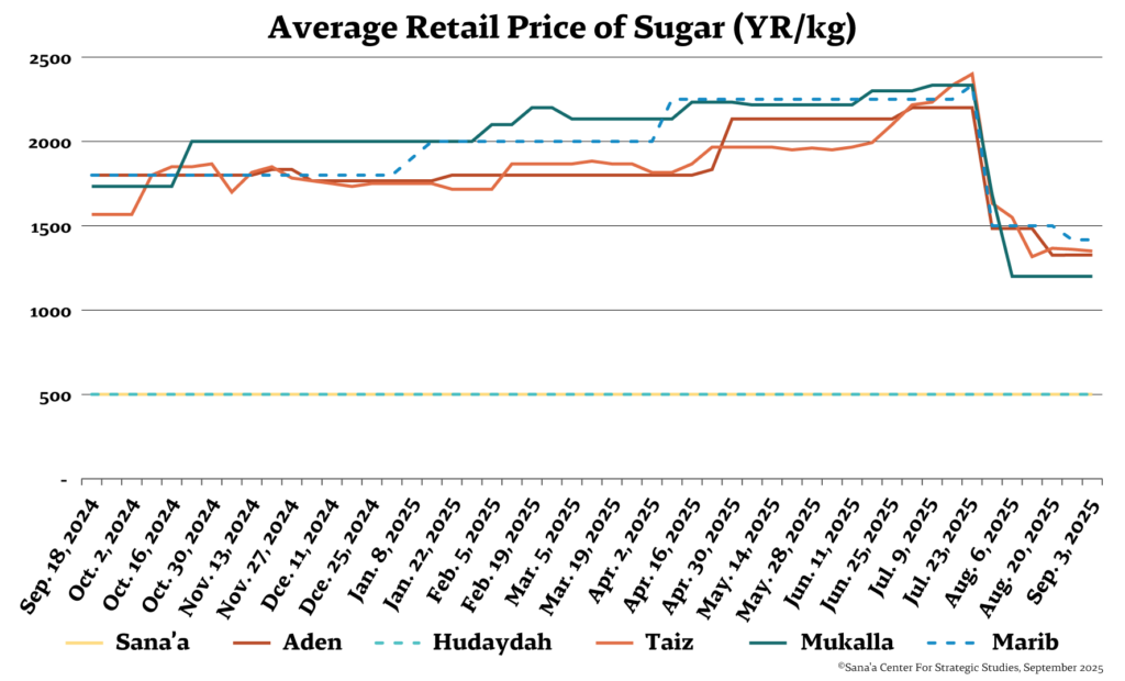 Food and fuel prices have witnessed a sharp decline in government-controlled areas following the rial’s recovery (see commodity price graphs below). Price reductions in Aden ranged between 20 and 40 percent for basic food commodities like wheat flour, rice, sugar, vegetable oil, and kidney beans. Beginning in August, local authorities conducted monitoring and inspection campaigns to ensure prices aligned with official price caps set by trade and industry offices.
