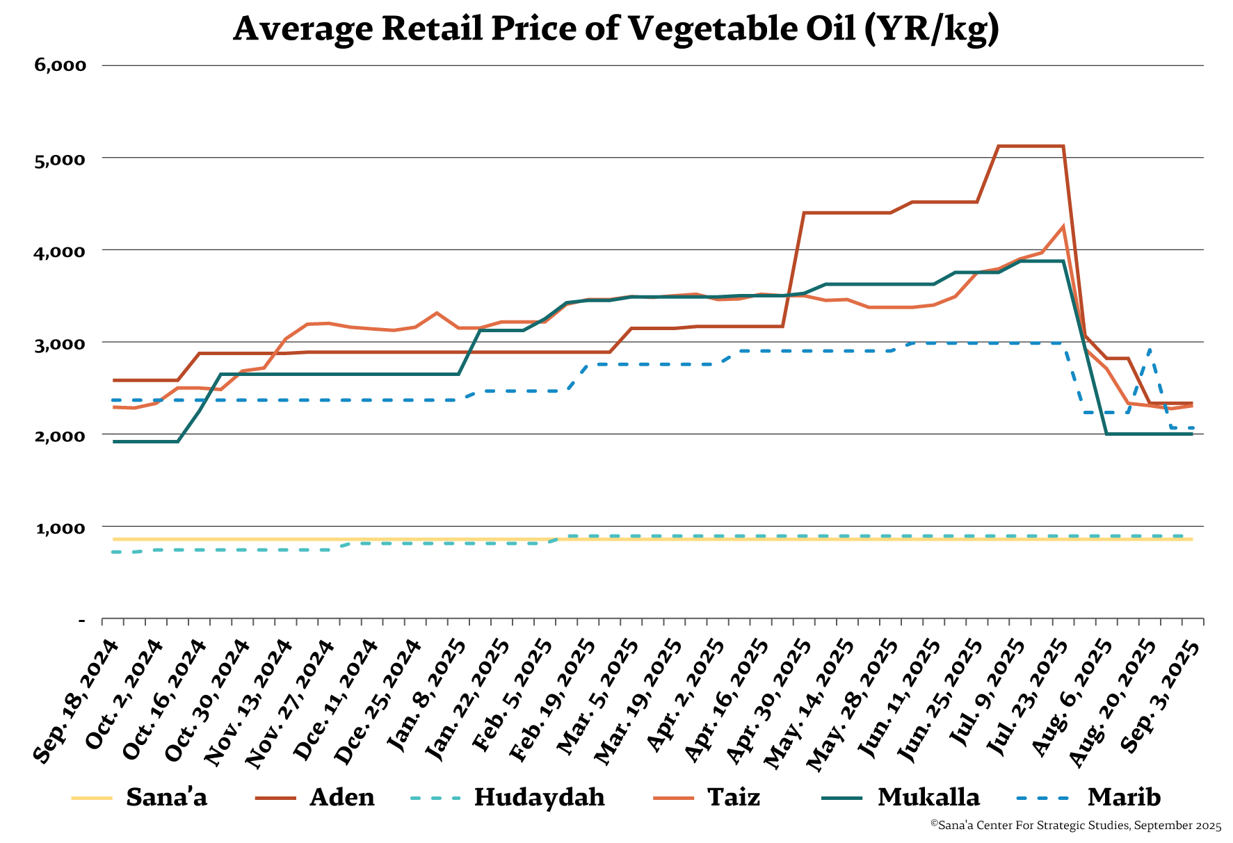 The rial remains stabilized near YR1,630, supported by the CBY-Aden’s sustained foreign exchange policy management and the late-September announcement of Saudi support. However, the value of the currency remains a critical concern, particularly if no further economic reforms are forthcoming. Long-term stability will require transforming recent interventions into sustainable policies and implementing structural reforms to access sustainable sources of foreign currency.