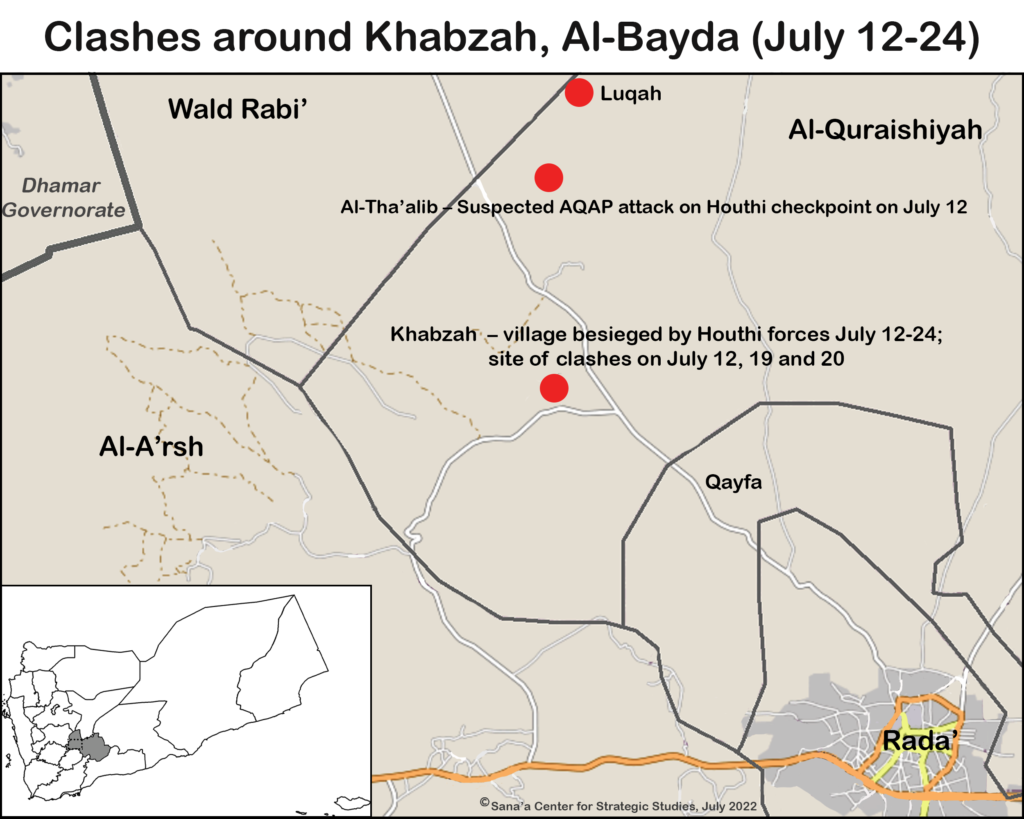Houthi forces laid siege to the village of Khabzah in Al-Bayda governorate on July 12 and fought with local tribal forces following an attack on a Houthi checkpoint. The conflict began on July 12, after gunmen from the Luqah area in Al-Quraishiyah district, suspected of belonging to Al-Qaeda in the Arabian Peninsula (AQAP), attacked the checkpoint at the entrance to the Al-Tha’alib area of Khabzah. The gunmen killed three Houthi fighters and seized their weapons before fleeing deeper into the village, according to tribal and local sources. In response, Houthi forces besieged Khabzah and called in reinforcements from Sana’a. After a local mediation approved by the office of Houthi leader Abdelmalek al-Houthi, the villagers issued a statement saying they did not condone the checkpoint attack, leading Houthi forces to step back and wait outside the village for the fugitives to be sent out. When they did not emerge the siege was reimposed and armed clashes resumed. On July 12, two Houthi fighters were killed and four were wounded, and on July 19-20, four tribal fighters, a woman and a child were killed. Local mediation resumed after the Al-Wahbi tribe sent 20 of its members as ‘hostages’ to the Houthis, a common show of good faith in tribal deconfliction negotiations, and a deal was reached on July 20 to halt the fighting and allow the wounded to be evacuated.