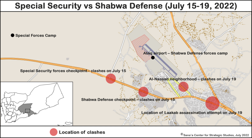 The attempt was preceded by orders to replace Special Security Forces commanders and a series of clashes between members of the Shabwa Defense forces and Special Security forces in Ataq. On July 15, clashes erupted between Special Security forces manning the Al-Kahraba checkpoint in the village of Gul al-Aadh western Ataq city, and the Shabwa Denfese forces, who were prevented from entering the capital. Two members of the Shabwa Defense forces and a civilian were injured. On the same day, an argument led to clashes at the ring road checkpoint manned by the Shabwa Defense force in the Al-Sawda area, western Ataq city, and members of the 1st Battalion of the Ataq Military Axis, commanded by Ahmed Lashqam al-Barassi. No injuries were reported.