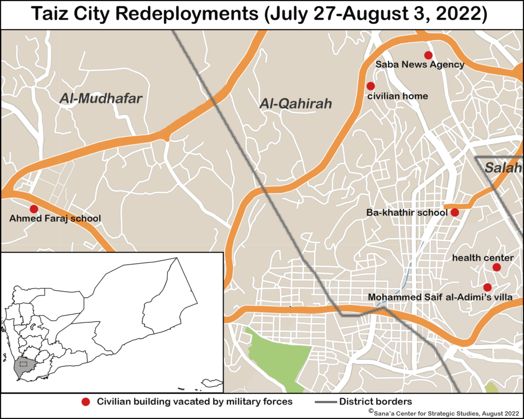 Following direct orders from now-former defense minister Mohammed Ali al-Maqdashi and National Resistance Forces leader and PLC member Tareq Saleh, the Islah-affiliated Taiz Military Axis began a systematic campaign to remove military units billeted in civilian buildings in Taiz city on July 27. Previous initiatives had failed to dislodge the troops, but the new campaign has made several arrests to enforce the decision. Saleh’s visit to the city and championing of the removal efforts are intended to garner local support for himself and the PLC.