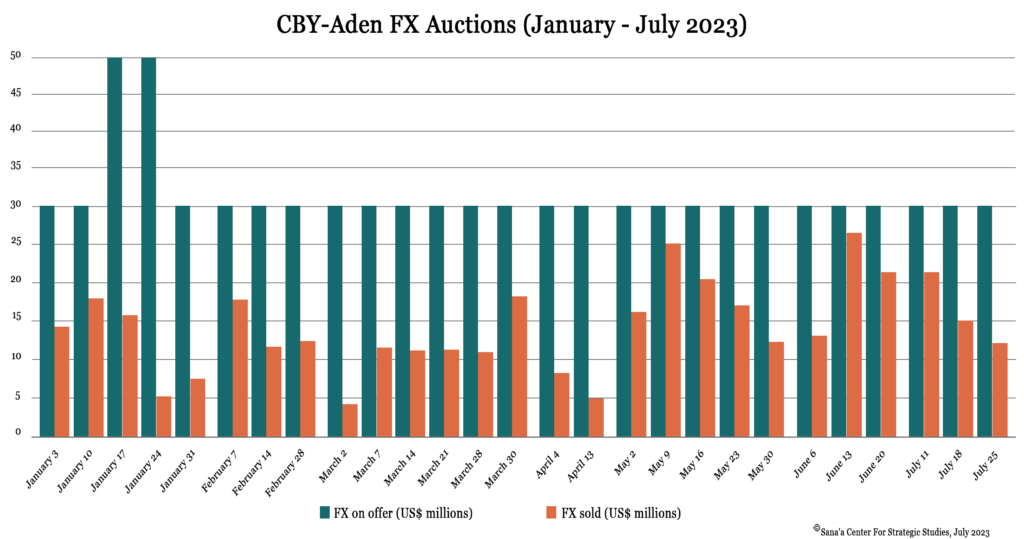 On August 1, the CBY-Aden announced it would postpone foreign currency auction no. 28 of 2023, due to continued improvement of the exchange rate driven by the announcement of new Saudi support. It said the delay came in response to requests from several banks, which wanted to wait until the rial rebounded further and its value stabilized. In June and July, the CBY-Aden announced the results of six FX auctions, valued at US$30 million each, which were 62 percent subscribed on average. Since the beginning of the year, 27 FX auctions have been held, with Yemeni banks purchasing US$391 million (46 percent) of the US$850 million on offer.