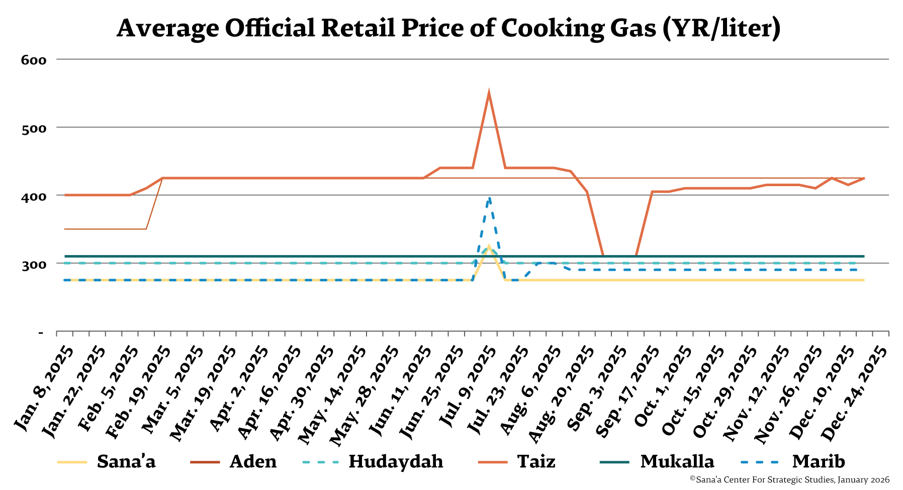 A widespread and severe gas shortage impacted Aden and other cities under government control from late November through December, and political instability and infighting prevented progress on a solution. The disruption resulted in long queues of cars and buses at the few stations that remained open. Citing depleted supplies, dozens of government-run filling stations across Aden suddenly closed, triggering a rise in black-market activity. The price of a 20-liter gas cylinder ranged between YR13,000 and YR15,000 in the second half of December, an increase of more than 52 percent above the official price of YR8,500.