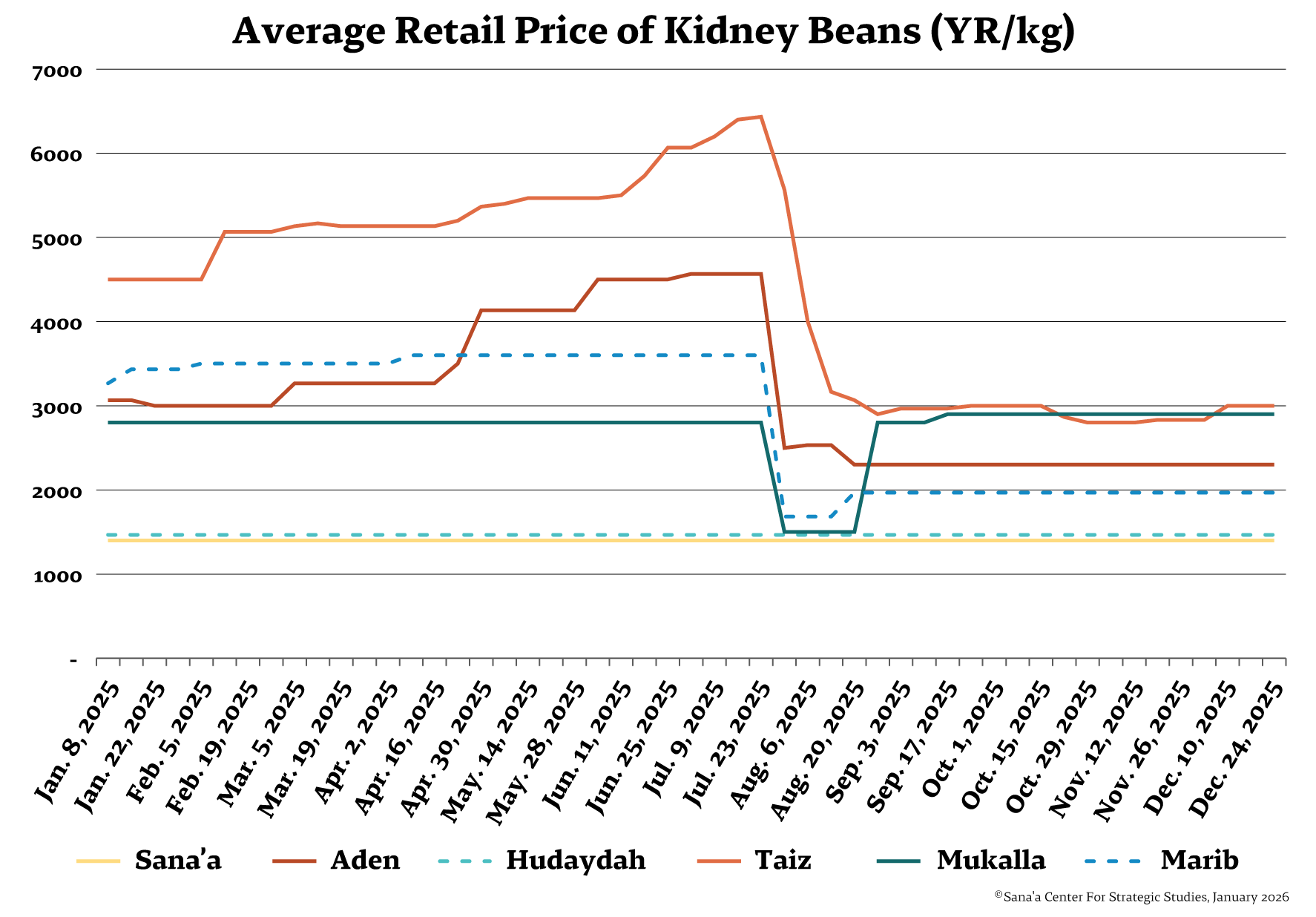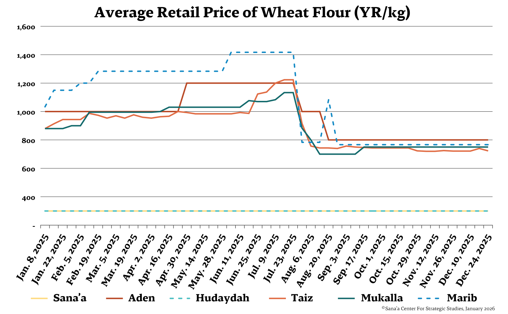The price of the new rial remained stable, trading around YR1,628 per US$1. It experienced a slight depreciation to YR1,644 per US$1 for a week in early December, triggered by the Southern Transitional Council’s military escalation in Hadramawt and Al-Mahra, which created a complex monetary and economic landscape. The price of old rials circulating in Houthi-controlled areas also remained flat, at YR536 per US$1.