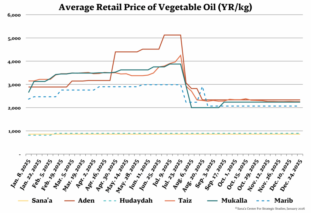 Broadly speaking, the cost of the minimum food basket (MFB) remained stable in government-controlled areas, rising only 1 percent month-on-month. However, this price is down 37 percent from the historic peak in July 2025 and 20 percent from November 2024. This was primarily attributed to the rial’s recovery and a decrease in transportation costs. The rial appreciated by 27 percent year-on-year, driven by the government-enforced measures to manage the exchange rate and tighten oversight of imports and hard currency transactions. As a result, the prices of essential food items declined by 26 percent for sugar, 20 percent for wheat flour, 23 percent for red beans, and 14 percent for sunflower oil. Likewise, fuel prices in November were 11 percent and 9 percent lower than the same period in 2024. Key drivers include the market’s gradual adjustment in line with currency recovery, partly underpinned by declining global crude oil prices. In addition, local crude oil production from Marib partly helps cover domestic fuel needs in government-controlled regions.