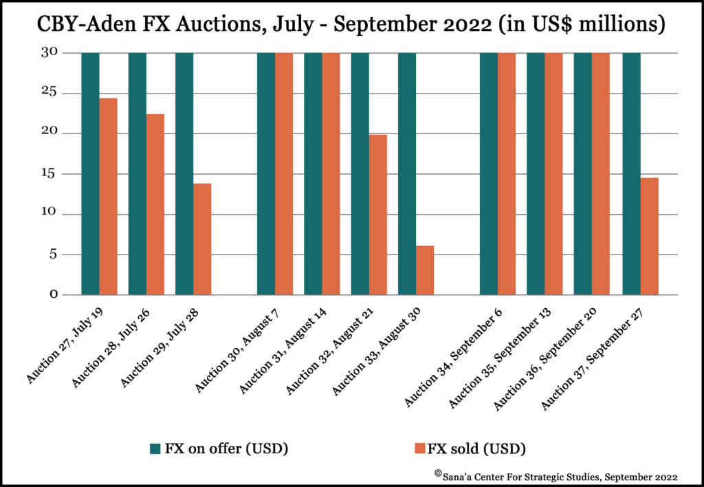 The CBY-Aden held four foreign currency auctions in September for banks to bid. The first three auctions, the 34th, 35th, and 36th of 2022, each had US$30 million on offer and were fully subscribed. The September 27 auction saw less than half the FX on offer sold. With dwindling FX reserves, the CBY-Aden has largely financed these auctions through receipts from the government’s limited hydrocarbon exports, as well as irregular Saudi support for government military and security salaries. While Riyadh has committed roughly 300 million Saudi riyals a month (almost US$80 million) for these salaries, the expected payments are occasionally canceled or delayed, putting increased pressure on the CBY-Aden’s FX stocks.